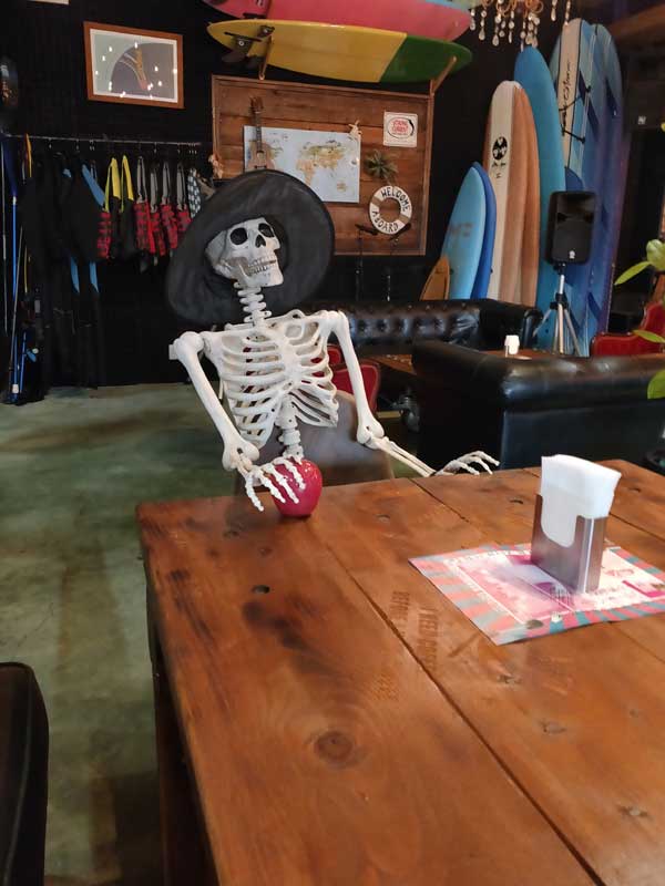 )×1、6人ソファーテーブル×1とカウンター席6人ほど。仕切りの向こうにはバイクやサーフボードなどが置かれていて壁の大型ディスプレイには薪の炎が揺れている。最初にカウンターのレジでメニューを見て注文・支払いをしてから席に座って持ってきてもらうシステム。