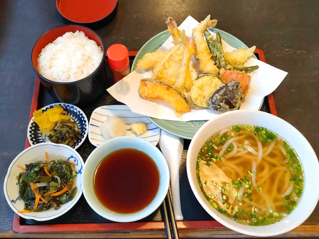 天ぷらセット1300円税込を注文。結構なボリュームだった。他には【 11~14時の唐揚定食・山芋定食・焼魚定食・煮魚定食各800円、かき揚げ定食650円 】 星野村定食・鮨定食・ジャンボ天ぷら定食・刺身定食各1850円、ヒレカツ定食1200円、雅御膳3000円、鉄火丼吸物付1000円、牛丼吸物付750円、わかめうどん/そば450円、きつねうどん/そば550円、肉うどん/そば580円、釜揚げうどん500円、親子丼(うどん)セット880円、かつ丼(うどん)セット1100円、キスの天ぷら600円、うなぎの半身1000円、枝豆300円とアルコール・ジュースなど。2025年8月