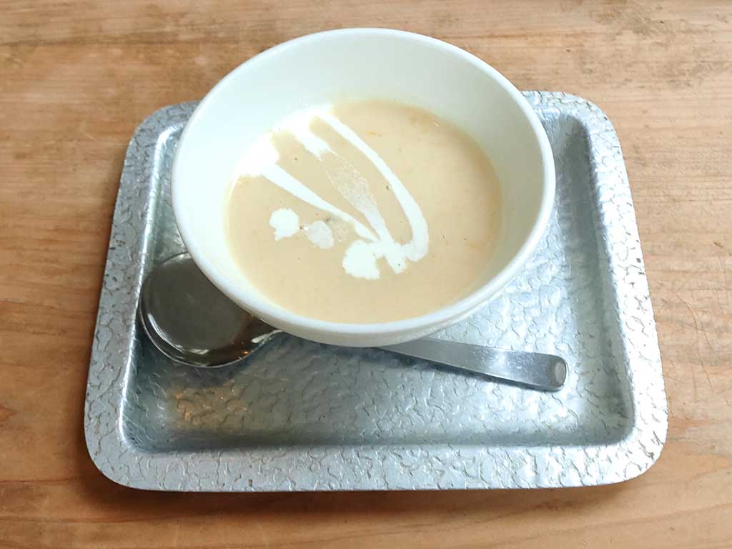 だった。平日の正午前に入店すると先客が一名のみ。パン屋さんがメインのため食事をする人はあまりいないのかも(週末は観光客など立ち寄る人が居る?)建物は老朽化が目立ち清潔さもいま一歩で気になる人もいると思う。二階は使われていないようで一階の奥が食事場所になっていて4人テーブル×2、2人テーブル×1、6人(8人)テーブル×1だった。Bランチ1900円税込を注文(ヌフのサイトの価格は古いままだ)最初に