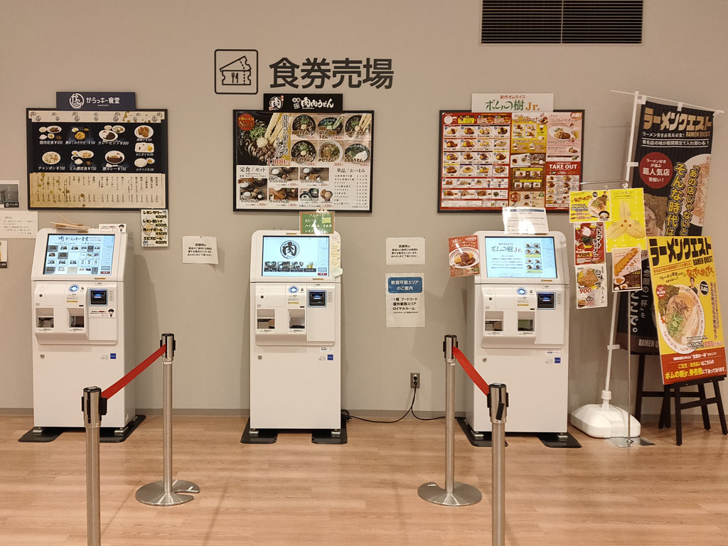 券売機で食券を買うタイプで冷水等はセルフサービス、各店舗ごとに返却口があるので食べ終わったら返却する。