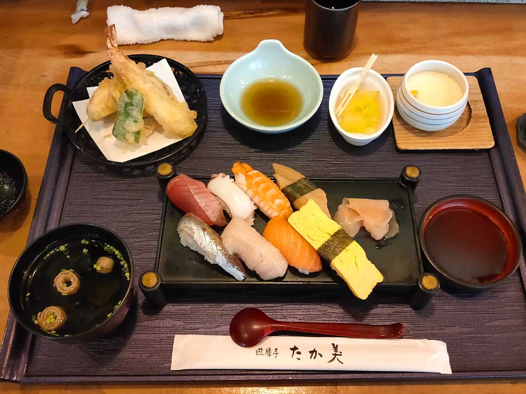 限定20食寿司ランチ1000円税込を注文。鮮魚卸だけあって新鮮なネタだった。他には限定20食ミックスフライ定食1000円、彩りランチ1300円、ハンバーグランチ各1350円、お子様松花堂1050円、たか美御膳2500円、ステーキ御膳・寿司御膳各2800円、創作にぎり御膳2950円、上にぎり2200円、会席料理や鍋コース、宴会も受け付けている。以前、佐賀市鍋島町の森田交差点角で