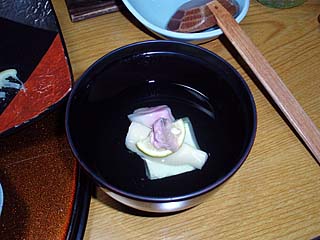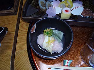 お品書き,食前酒 桜酒,前菜 季節の先付け盛り,吸物 鶯豆腐,造里 新鮮刺身盛り,煮物 道明寺桜蒸,酢物 サーモン網笠蓮根,洋皿 赤座海老パイ包み焼き,強肴 白濁鍋,食事 蟹と茸の釜飯,水菓子 苺ムース,やまもみじの宿 八芳園 料理長 佐藤英樹