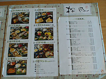 | 唐津シーサイドホテル和食処「松風」ランチメニュー2012年7月(クリックで拡大)、ディナー(夜)は値段がアップ |