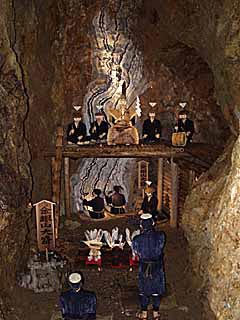 | 金山構内の人形。金の大鉱脈が発見され,神に感謝の祈願がされている所です。 |