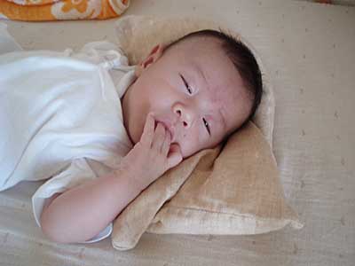 | お決まりのポーズ(拡大)。おっぱいやミルクを飲み終わるとすぐに指を咥えるほどおしゃぶりするのでみんなから「指おいしいですか?」と言われています。 |