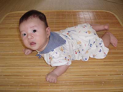 寝返りのビデオが撮れました。でも寝返りしても身動き出来ずしばらく首をあげてジタバタしてますが,そのうち苦しくなって泣き叫びます。だったら寝返りしなければよさそうなものですが気分が良いと何度も続けて寝返りします。うつぶせになるとよだれが垂れたり苦しくなってミルクを吐いたりします。膝や足も少し擦りむいています。まだハイハイはできません。