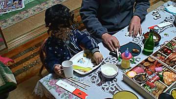 じいちゃんばあちゃんとおせちを食べました。乾杯するのが好きでみんなと乾杯していました