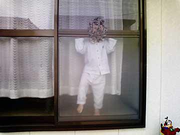 お父さんが帰宅する車の音に気付いて窓越しにのぞきます