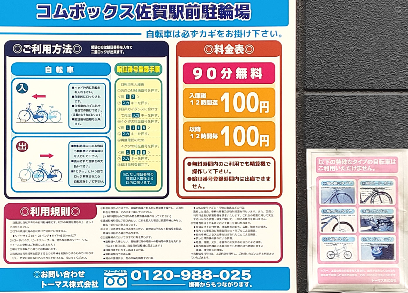 - 料金は後払いで90分以内は無料だが精算は必要、90分を超えると12時間100円(12時間を超えると加算)暗証番号が設定可能