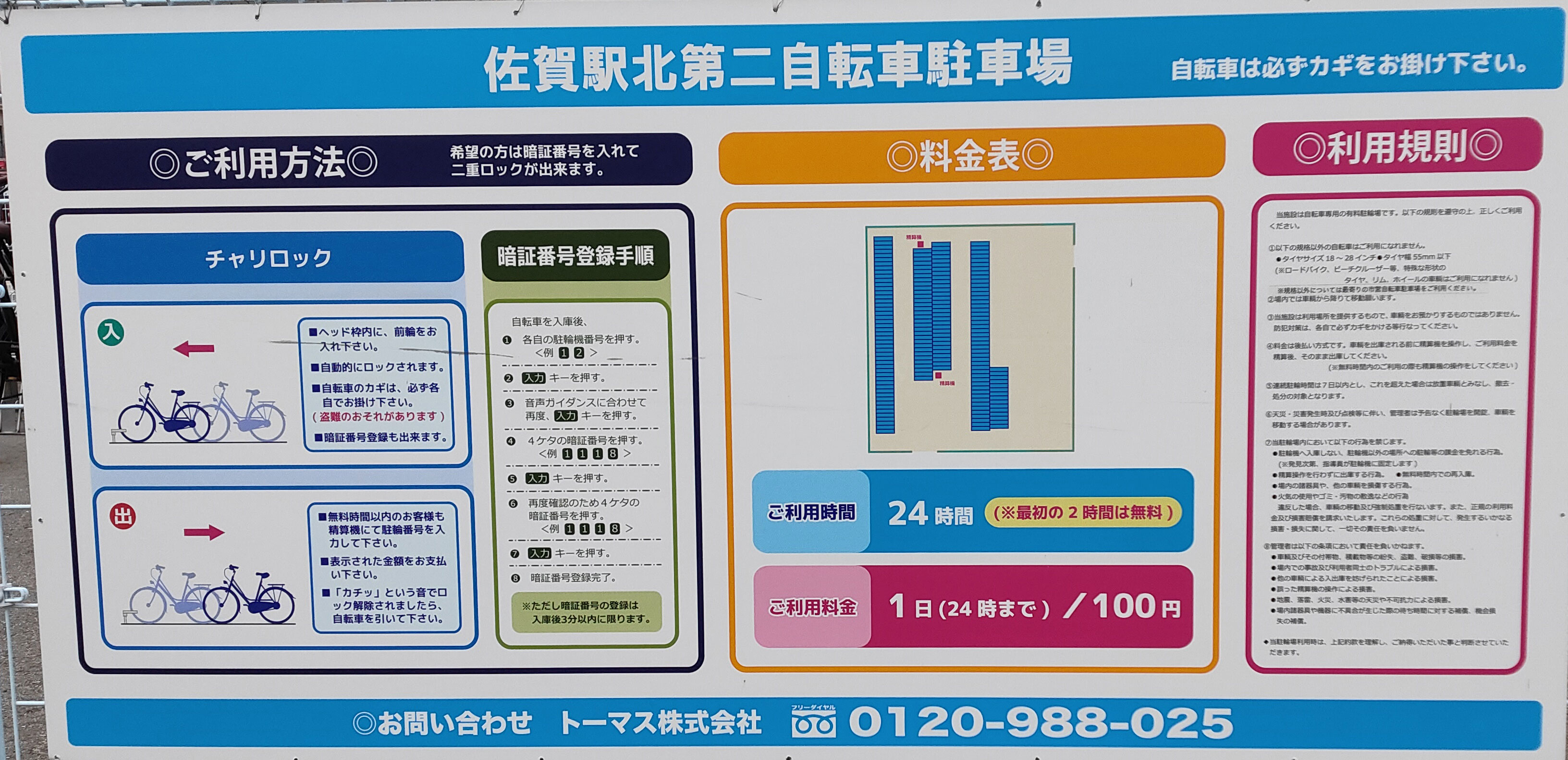 - 料金は後払いで2時間以内は無料だが精算は必要、2時間を超えると1日100円(深夜0時を過ぎると100円加算)