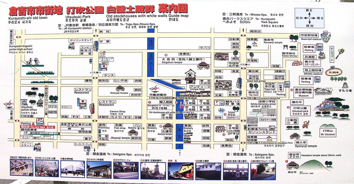 白壁土蔵群周辺マップ/15:14。近くの倉吉博物館に行ったのですが祝日の翌日だったので休館日でした。残念!!,倉吉博物館斬り!,拙者,休館日も確認せずに気ままに旅してますから!切腹!!。