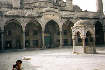イスタンブールの「スルタナーメット・ジャミイ寺院」(別名ブルー・モスク)。柱や壁が青を基調としたタイルで飾られていることからブルー・モスクの別名があります。